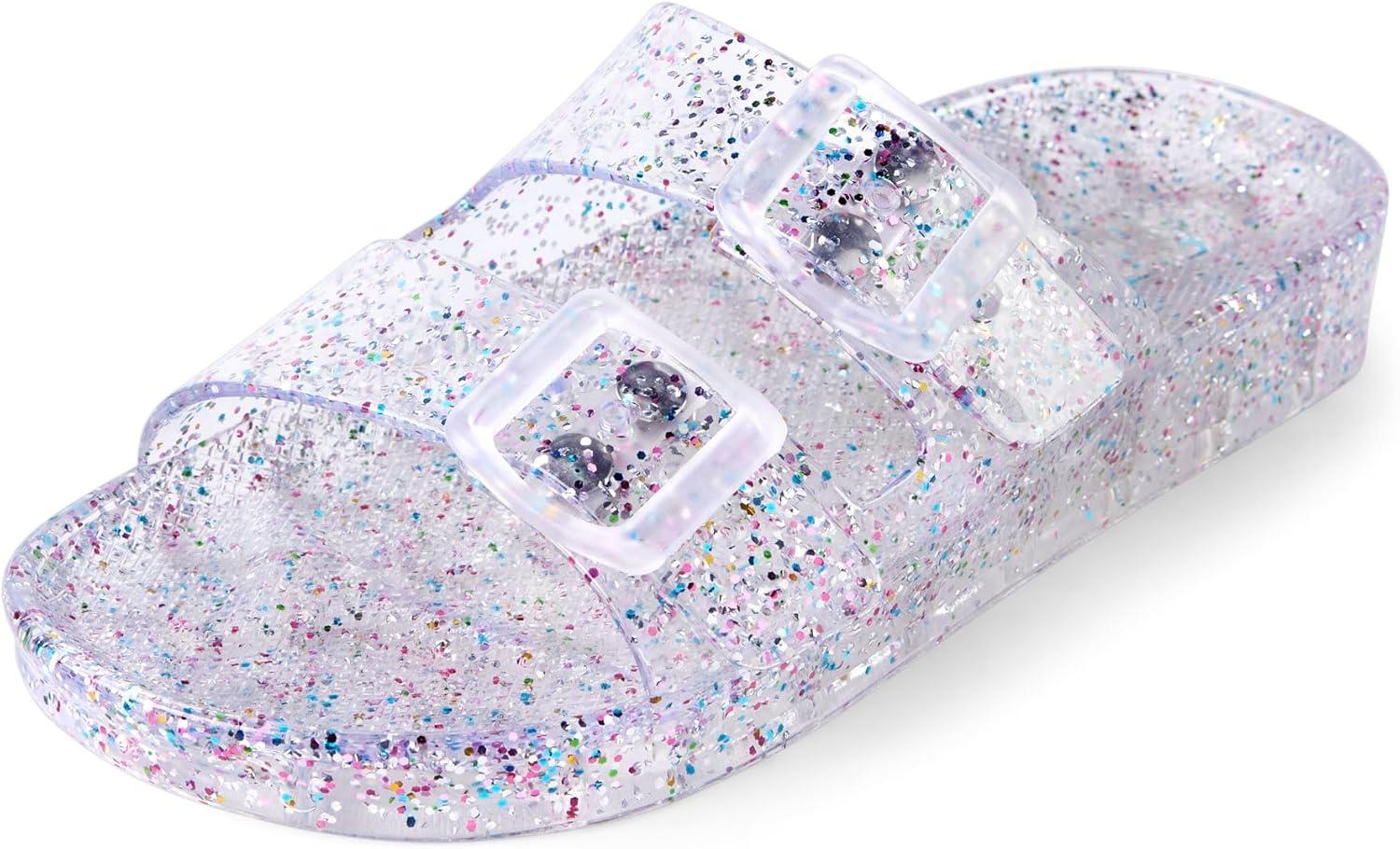 The Children’s Place Girls Double Buckle Slip On Slide Sandals, White Paint Splatter(Clear Glitter Jelly)