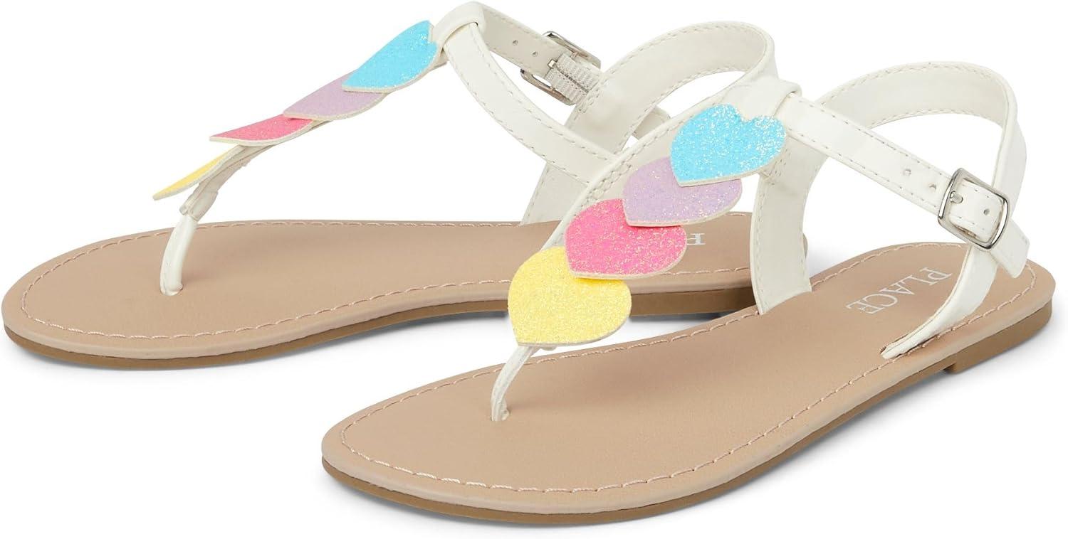 The Children’s Place Girls T-Strap Sandals with Adjustable Ankle Strap(White Multi Hearts)