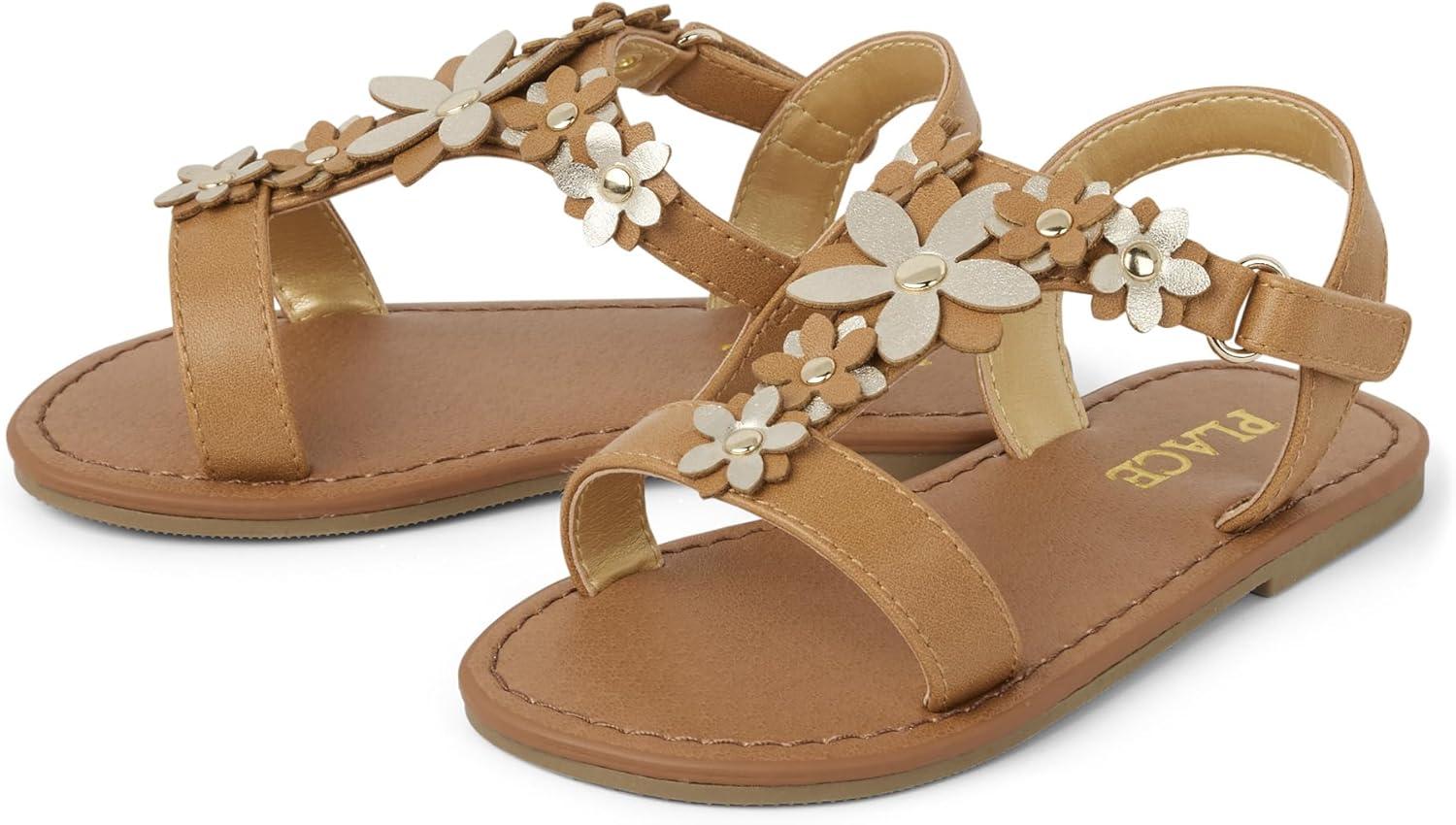 The Children’s Place Baby Girls and Toddler T-Strap Sandals with Adjustable Ankle Strap(Tan Flower)