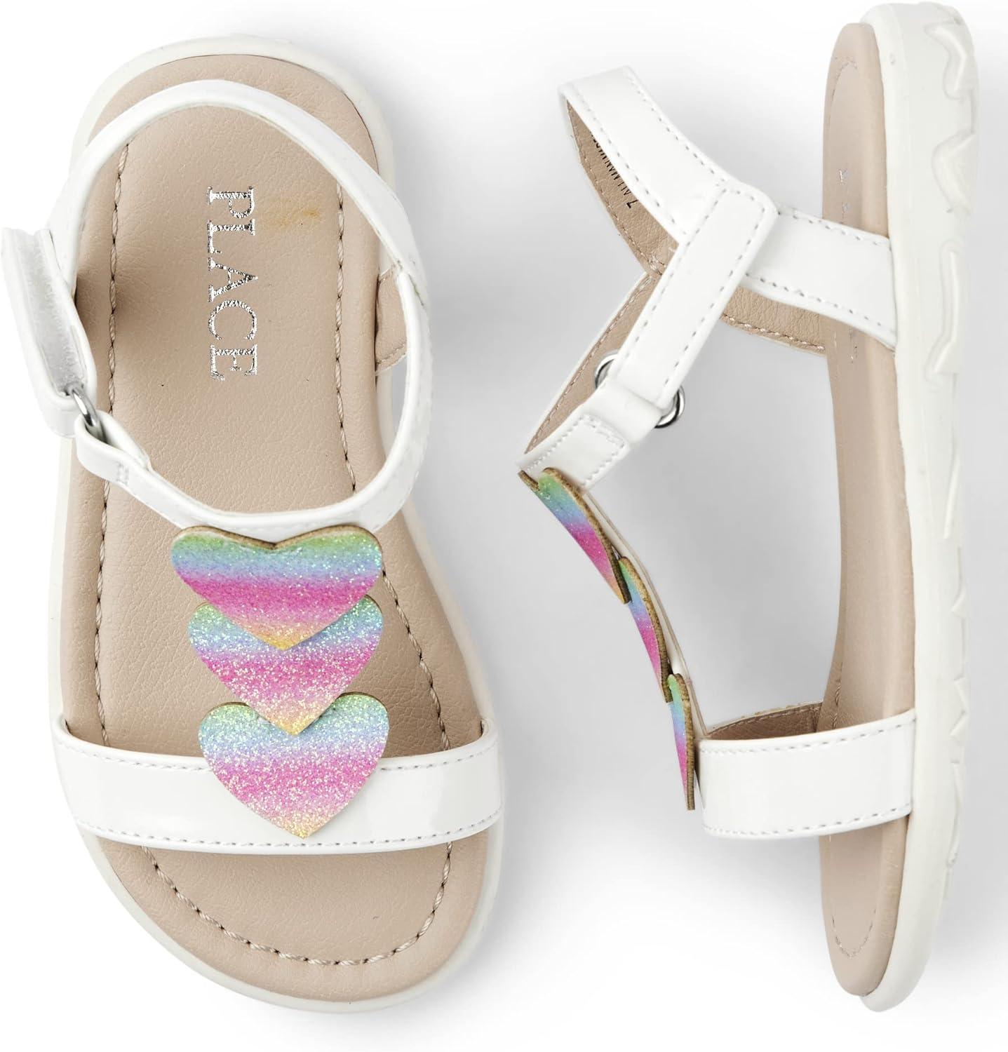 The Children’s Place Baby Girls and Toddler T-Strap Sandals with Adjustable Ankle Strap(White Glitter Hearts)