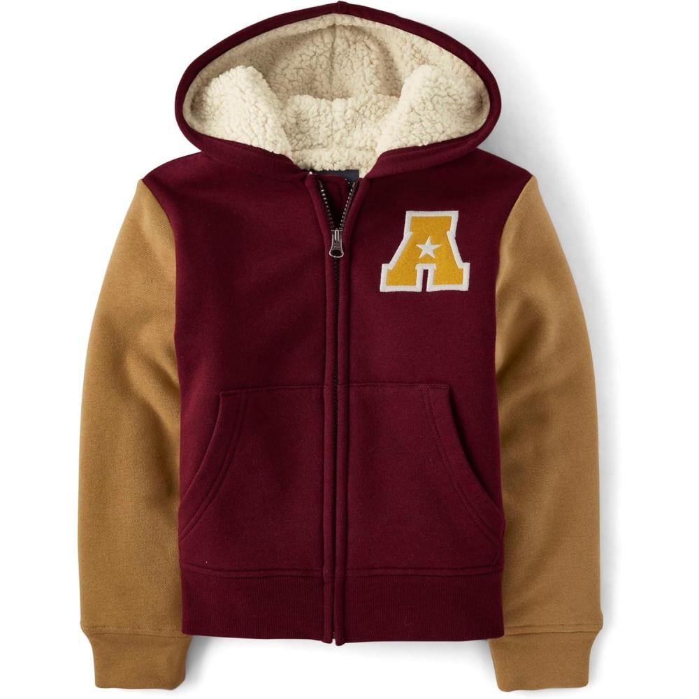 The Children’s Place Boys’ Long Sleeve, Sherpa Lined, Zip-Front Hoodie Sweatshirt(Redwood Varsity)